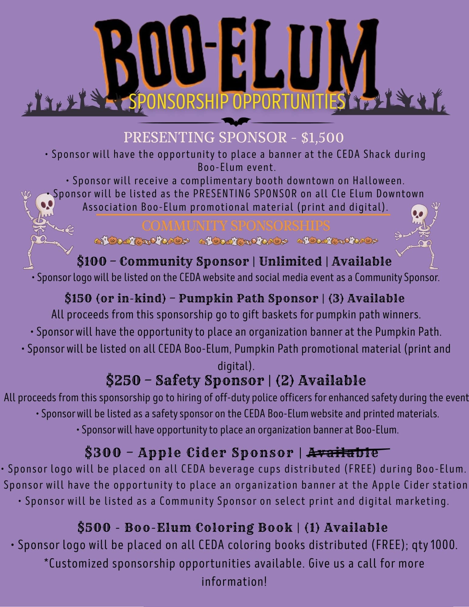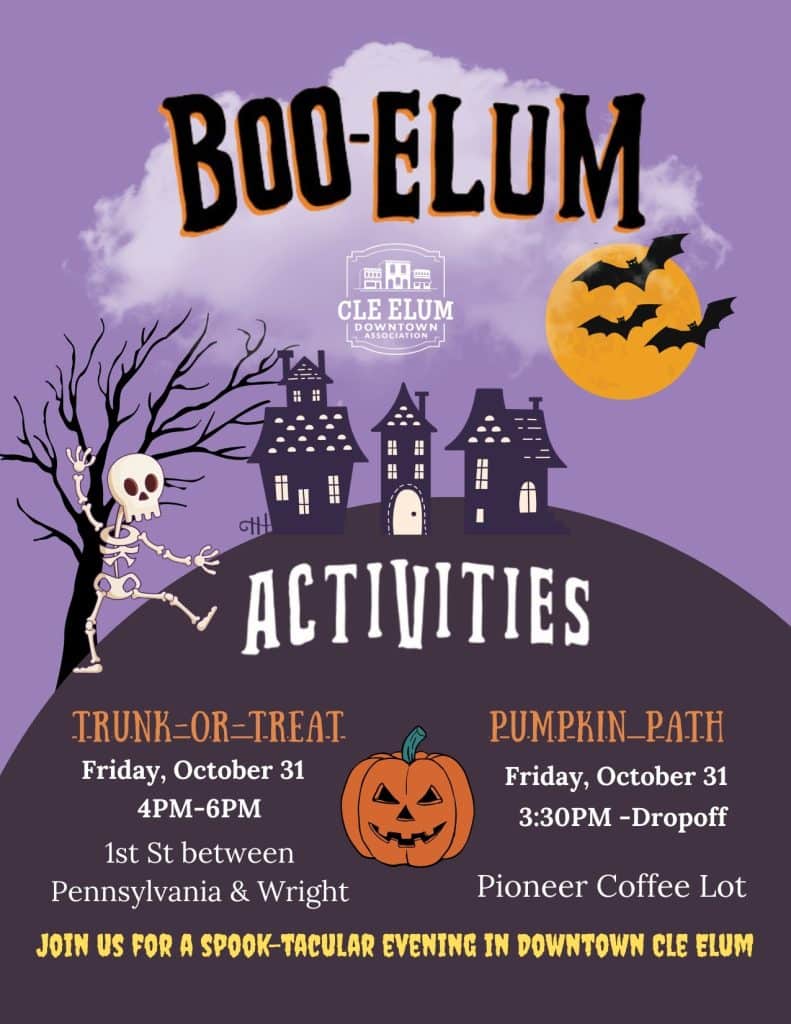 Trunk-or-treat is back! Boo-Elum starts with a costume parade, led by the CERSD Marching Band at 4:00 PM. Then onto trick-or-treating downtown businesses along 1st Street and of course the Trunk-or-Treaters! Wear your favorite costume! Don’t forget your favorite candy bag or candy bucket!
