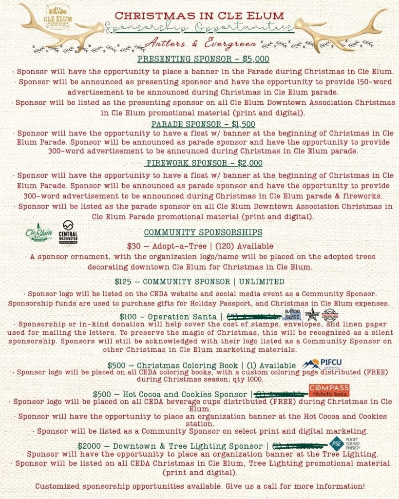 Sponsorships help support free, family-friendly holiday programming, local business activation, and festive traditions that make Cle Elum shine all season long. β¨